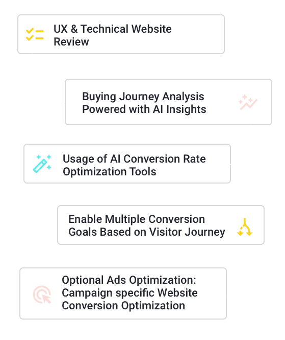 When it comes to Conversion Rate Optimization – most agencies stop at A/B When it comes to Conversion Rate Optimization – most agencies stop at A/B testing. This approach requires a lot of time and leaves valuable potential unused. We use an alternative route and make use of AI insights & tools for a smart buying journey. This gets you direct improvements faster & with less effort. Expect 1.5x more leads.