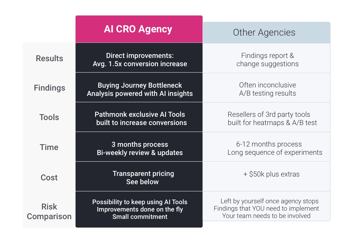 When it comes to Conversion Rate Optimization – most agencies stop at A/B testing. This approach requires a lot of time and leaves valuable potential unused. We use an alternative route and make use of AI insights & tools for a smart buying journey. This gets you direct improvements faster & with less effort. Expect 1.5x more leads.