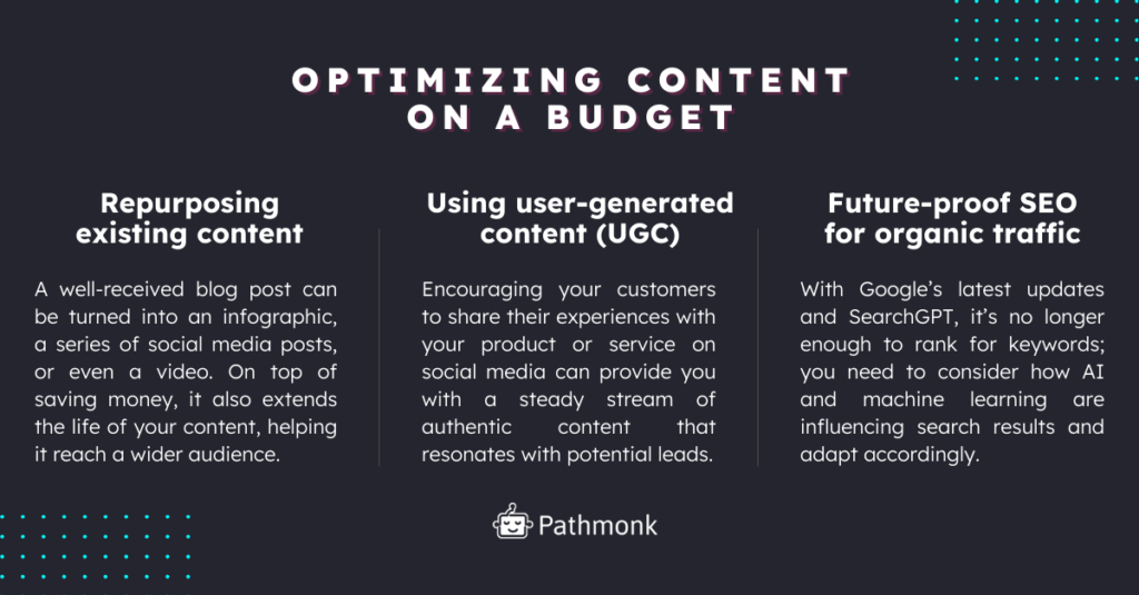 One of the most effective ways to keep content costs down is by repurposing existing content. For example, a well-received blog post can be turned into an infographic, a series of social media posts, or even a video. This not only saves you money but also extends the life of your content, helping it reach a wider audience.