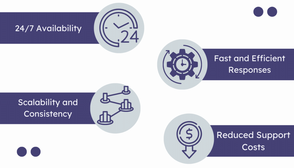 • 24/7 Availability: Unlike human agents, virtual assistants, and chatbots are available round the clock, providing support and information to customers at any time. This ensures that customers receive timely assistance while minimizing wait times, leading to increased satisfaction and improved customer experience.