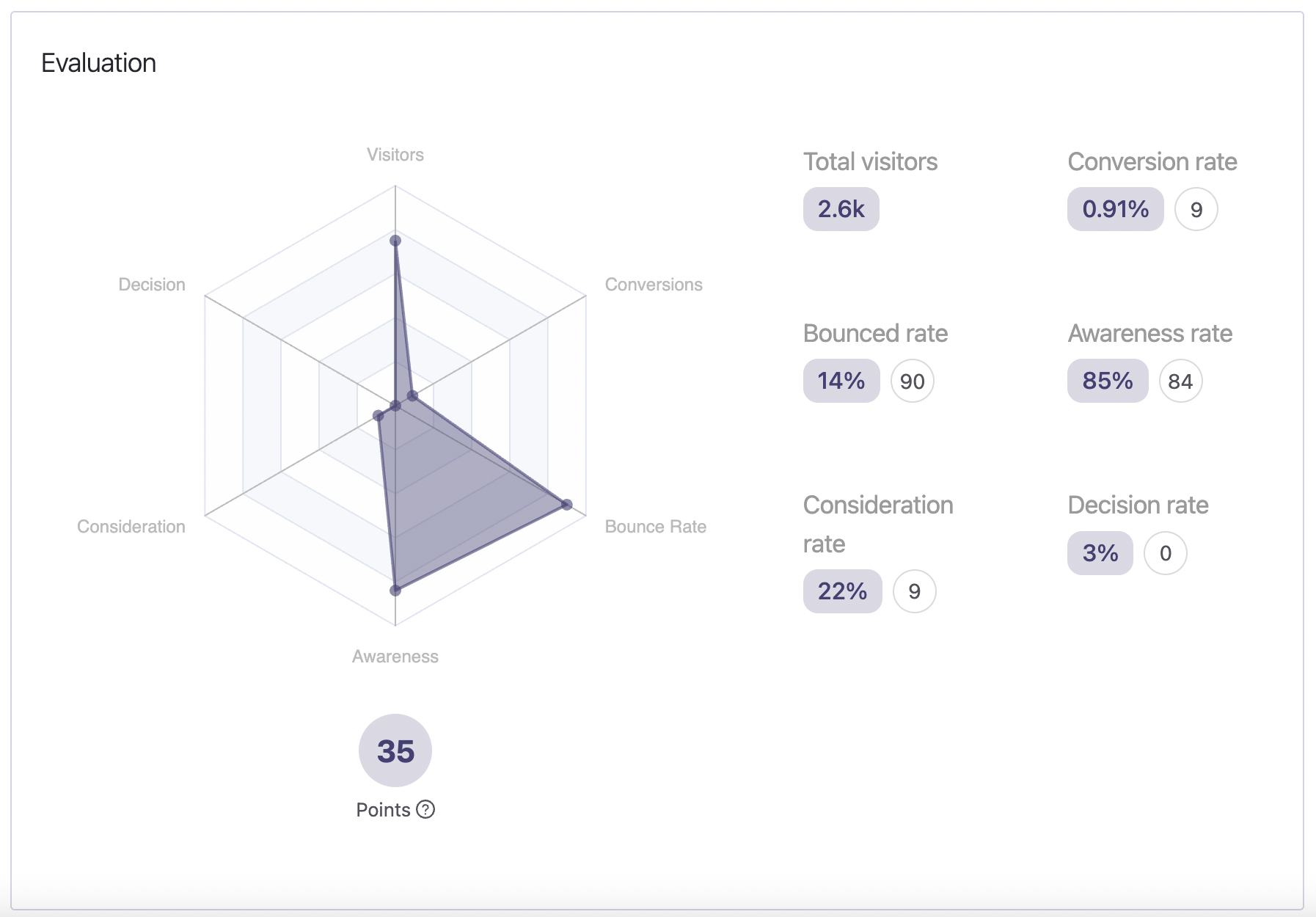 - Metrics to check: Visitors, Bounced Rate, Awareness Rate, Consideration Rate, Decision Rate, Conversion Rate