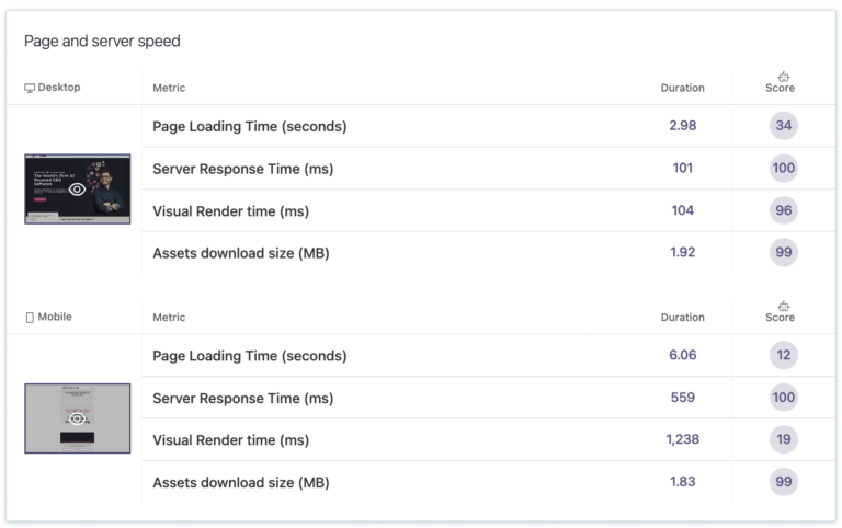 For every page analyzed, Pathmonk Intelligence provides Page and server speed information, enabling a detailed comparison between desktop and mobile performance. This section highlights opportunities to improve mobile site speed, a critical aspect of mobile optimization, and allows you to identify specific pages on your site that may be slow to load on mobile devices. Address these issues to improve the mobile user experience.