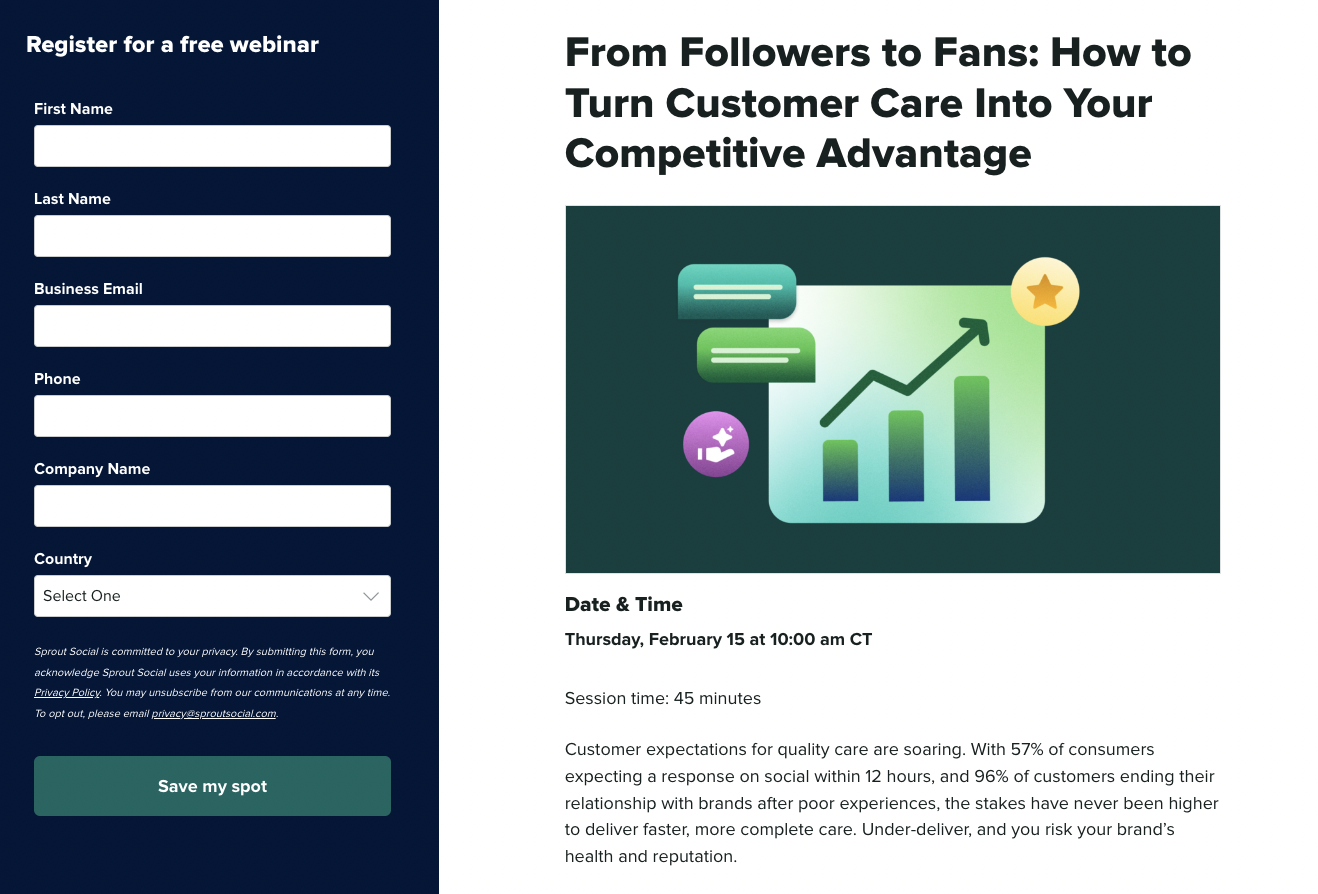 The Sprout Social webinar landing page for “From Followers to Fans: How to Turn Customer Care Into Your Competitive Advantage” effectively highlights the importance of customer care in building brand reputation and loyalty. It emphasizes the urgency of responding to consumer expectations on social media, showcasing Sprout Social’s solutions for streamlining customer care with a sophisticated case management system and AI-driven suggestions. The page positions the webinar as an invaluable resource for businesses looking to enhance their social customer care capabilities, featuring expert speakers and a live demo for practical insights.