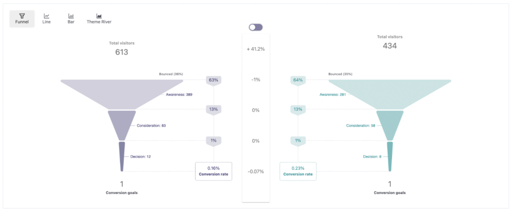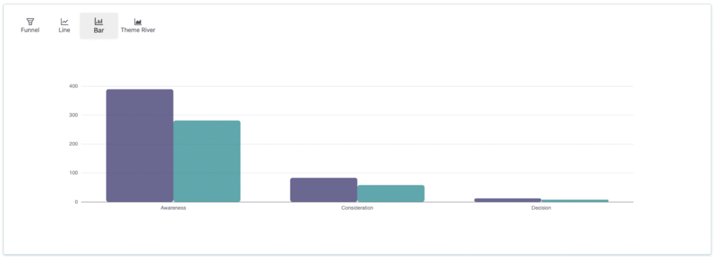 5. As a default setting, your data is presented in a funnel format; however, Pathmonk Intelligence offers the flexibility to opt for alternative visualization formats like ‘line’, ‘bar’, and ‘theme river’ to enhance the clarity and versatility of your reports.
